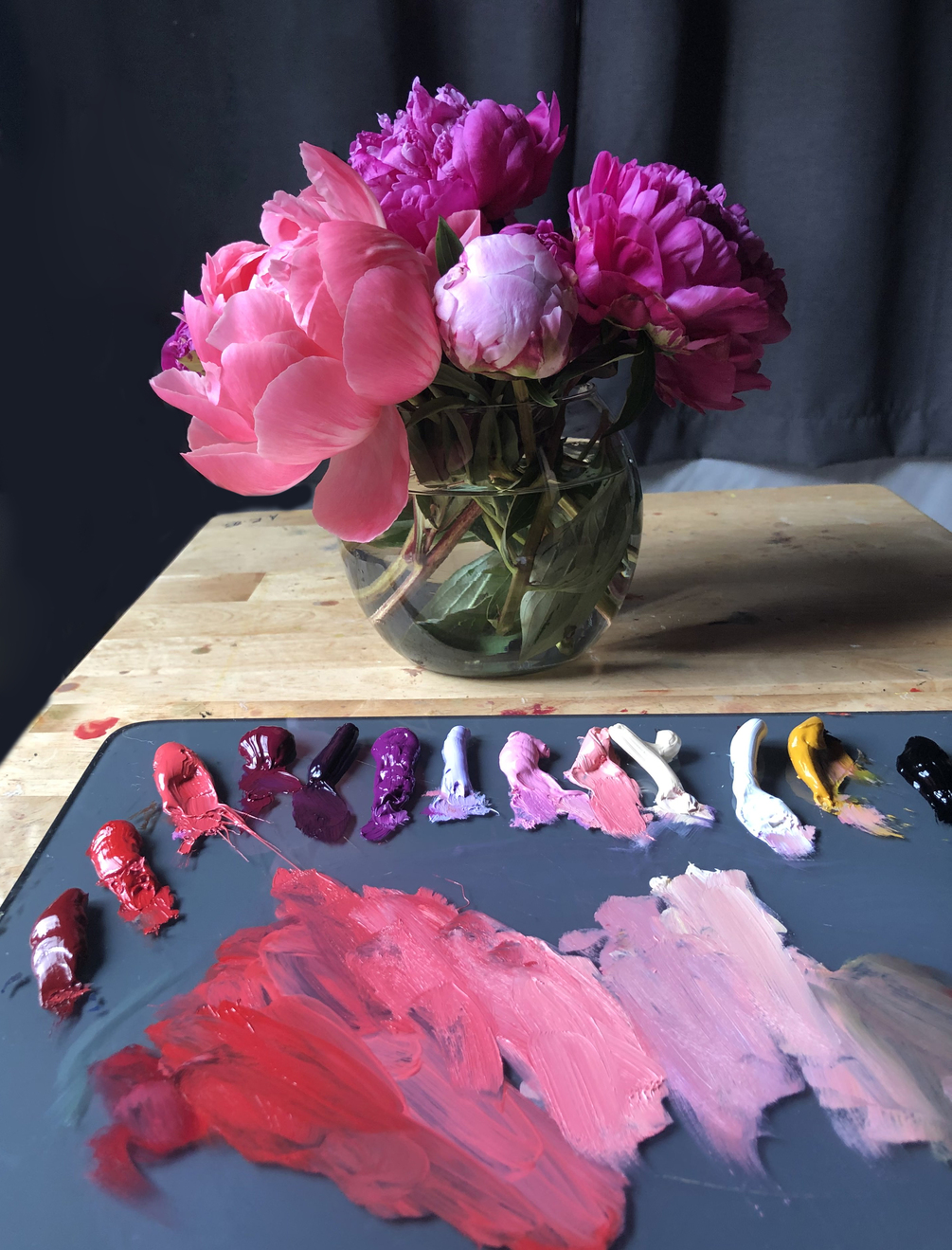 Anna gives three separate painting demonstrations on mixing pinks for different varieties of peonies, in oils.
