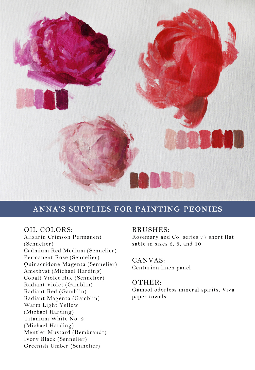 Anna gives three separate painting demonstrations on mixing pinks for different varieties of peonies, in oils.